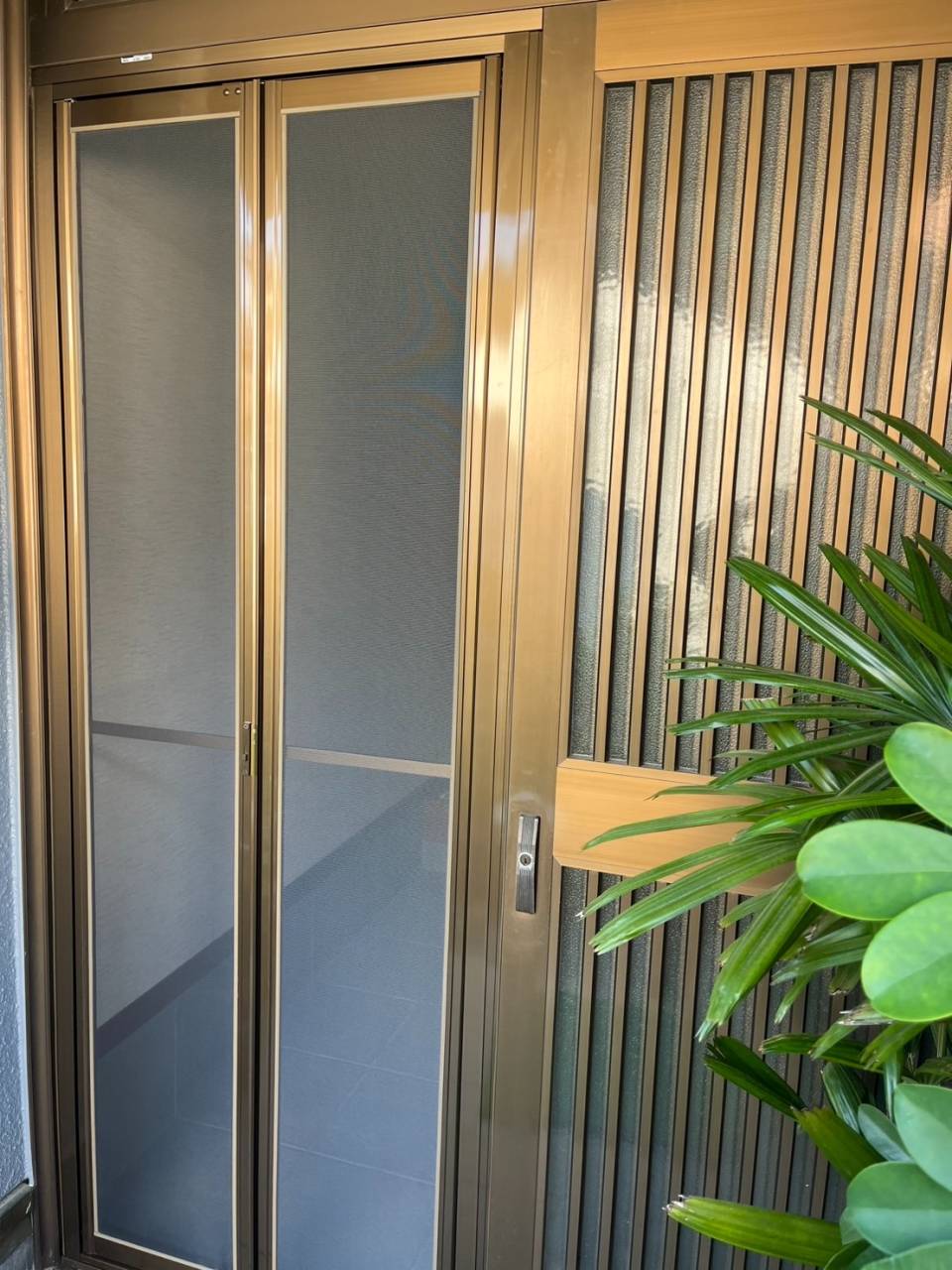 玄関の2枚引戸にジャストフィットする中折網戸。二つに折れて開閉するため、出入りの際もジャマになりません。