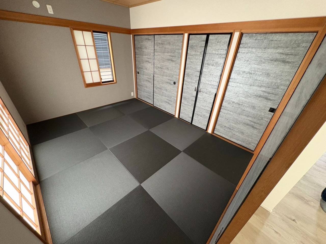 和紙畳 墨染色(すみぞめいろ) 2025/07/06 和紙畳 墨染色(すみぞめいろ) 畳も襖もシックな色に張替する事で、スタイリッシュな和室になりました。 モダンなインテリアとも相性が良くオススメです。