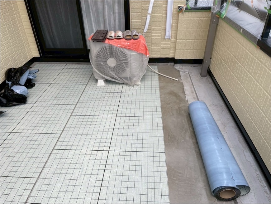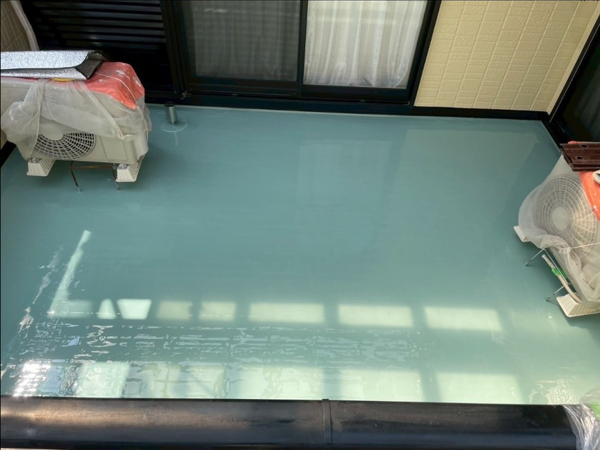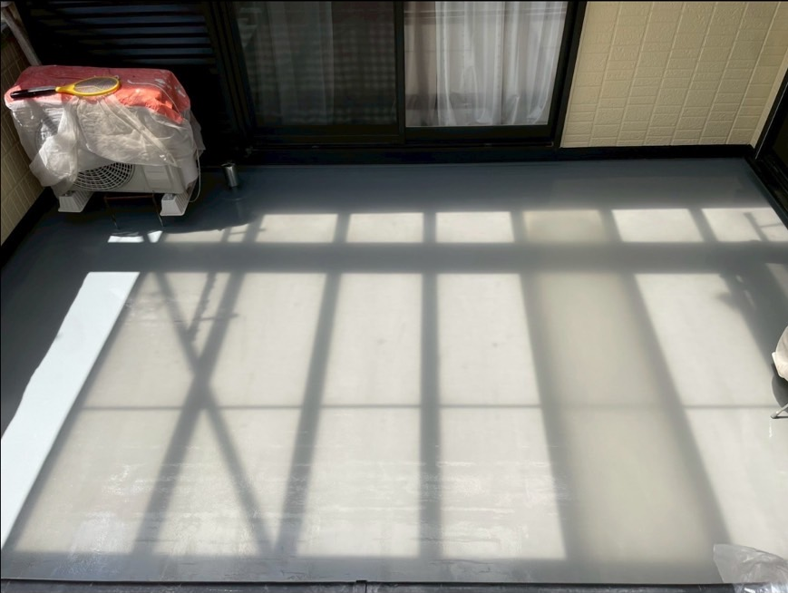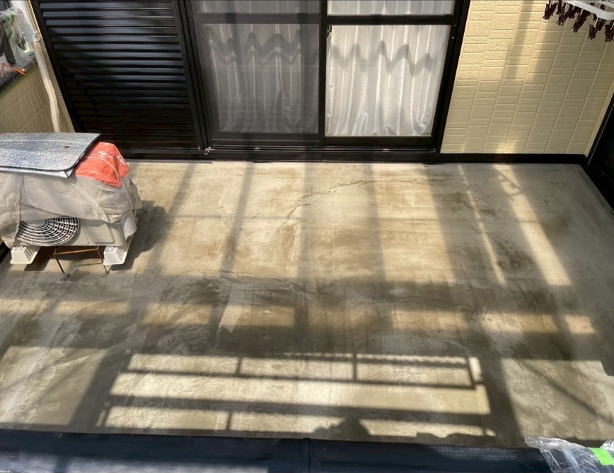 バルコニー勾配調整・防水塗装 2025/09/18 バルコニー勾配調整・防水塗装 劣化による欠損で勾配が出来て水溜まりができていました。 欠損箇所を補修、勾配調整したのち、通気緩衝工法X-1で防水塗装をしました。 また水抜きのためにドレン(排水口)も設置しました。 バルコニー床は、経年劣化によって防水性が低下していきます。 劣化により、雨水が建物内部に侵入し、雨漏りの原因となります。 10年から15年ほどが塗替時期になります。