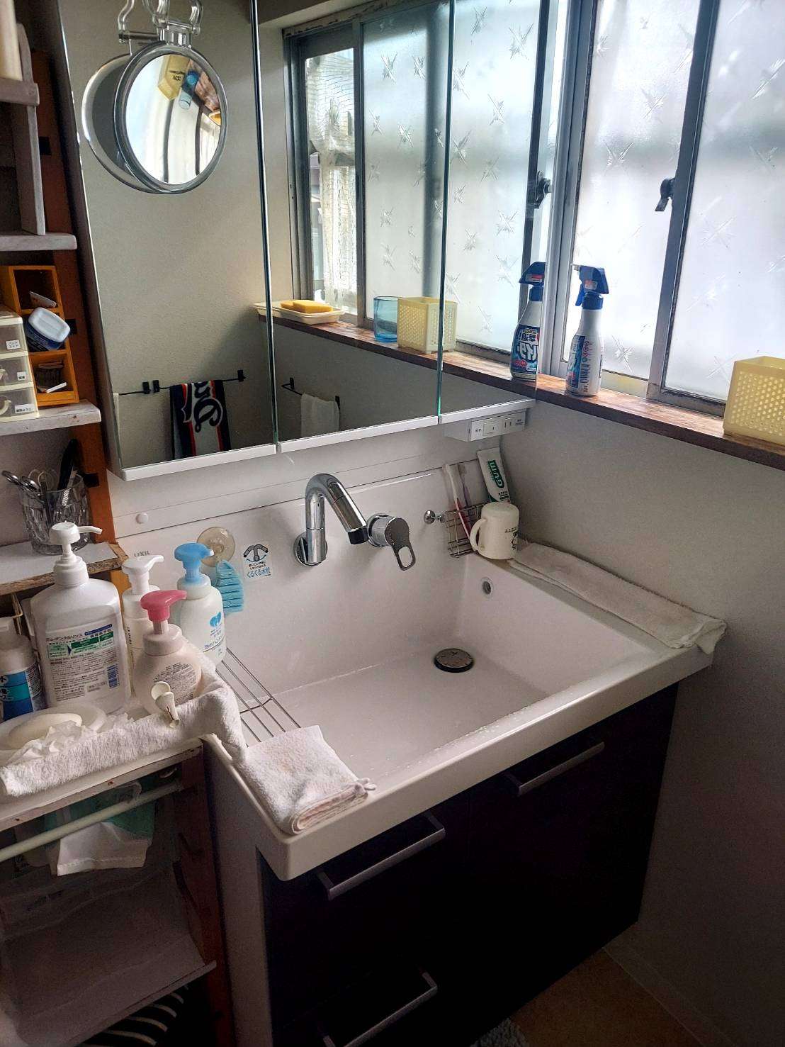 長年使用し、収納や清掃面で不便が出ていました。 新しい洗面化粧台へ交換。収納力と使いやすさがアップしました。